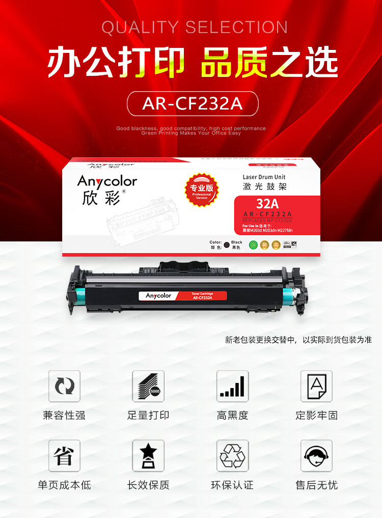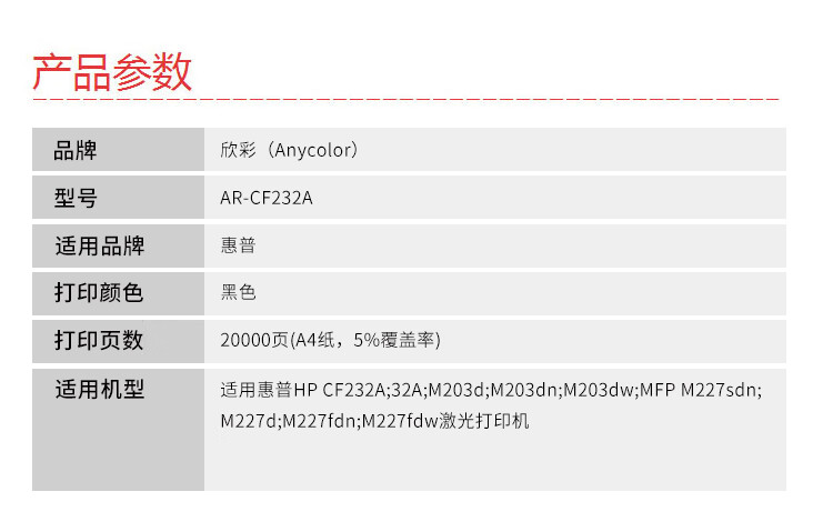 商品名稱:欣彩(Anycolor)AR-CF232A鼓架(專業(yè)版)hp32A 帶芯片 適用惠普M203d M203dn M227fdn 硒鼓 不含粉盒(計價單位:支)